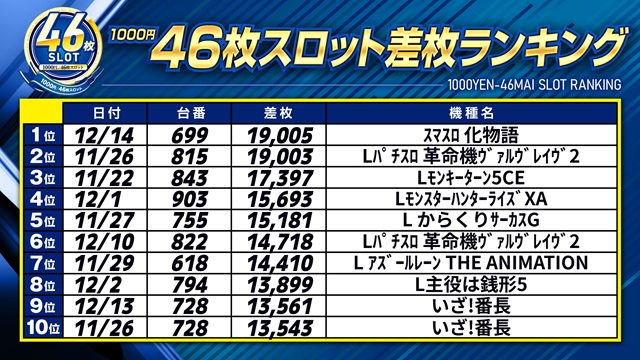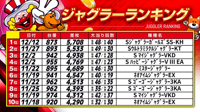 スロット設置機種は《メイン機種》→《ジャグラーシリーズ》→《バラエティ》 台数の多いもの順に表示されています。