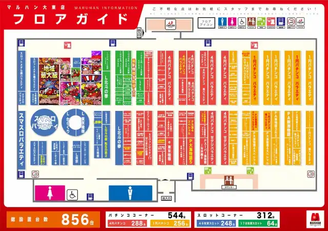 | 稼働台数 | パチンコ544台 / パチスロ312台 |