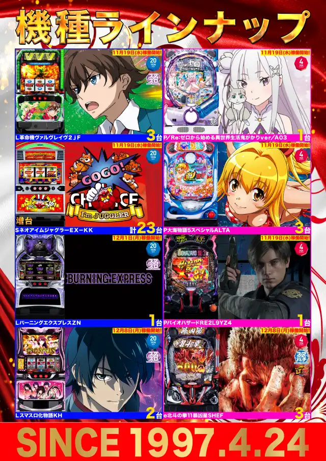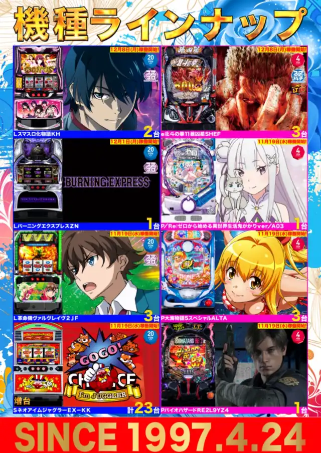 | 稼働台数 | パチンコ329台 / パチスロ168台 |