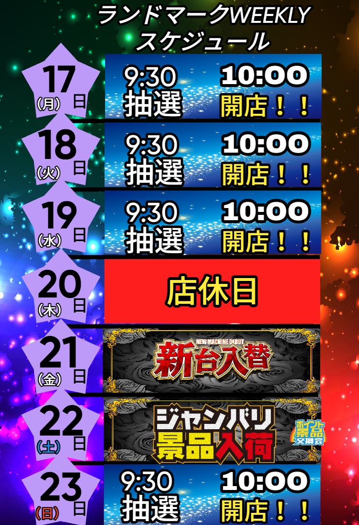 | 営業時間 | 10:00 ~ 22:50(定休日:入替検査時、木曜日が店休日となります) |