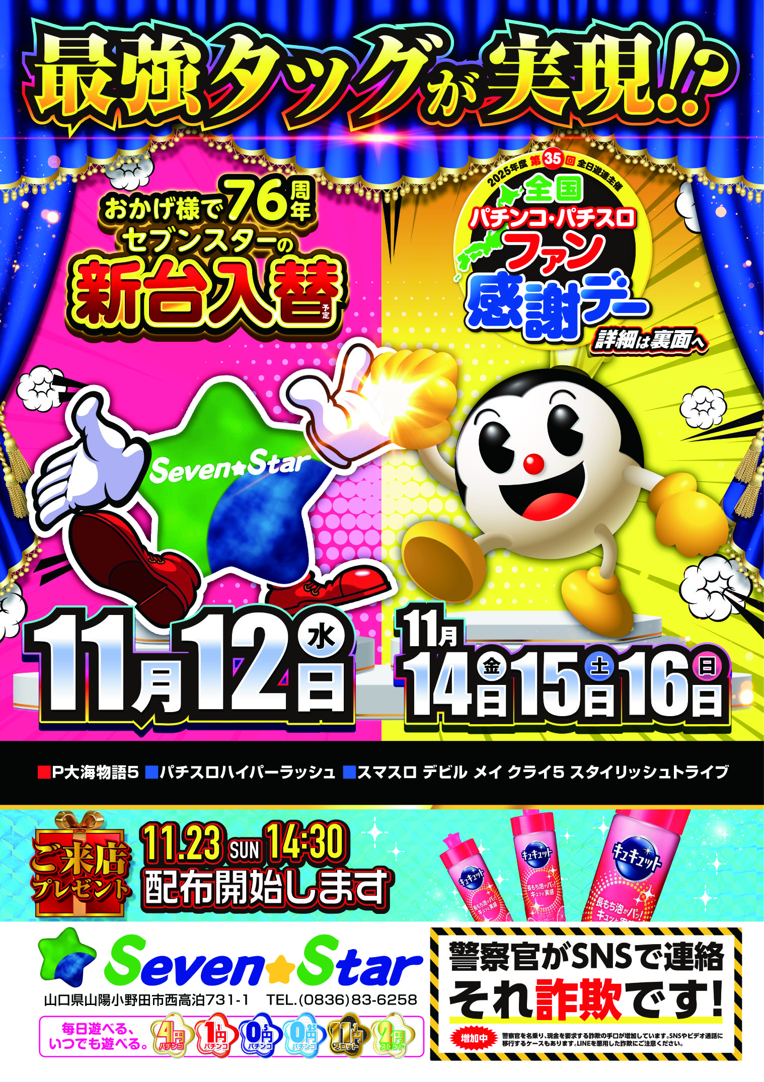 | 営業時間 | 09:00 ~ 22:50(定休日:11月12日[水]朝9時オープン!セブンスターの新台入替!!(予定)) |