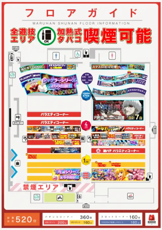 | 稼働台数 | パチンコ360台 / パチスロ160台 |