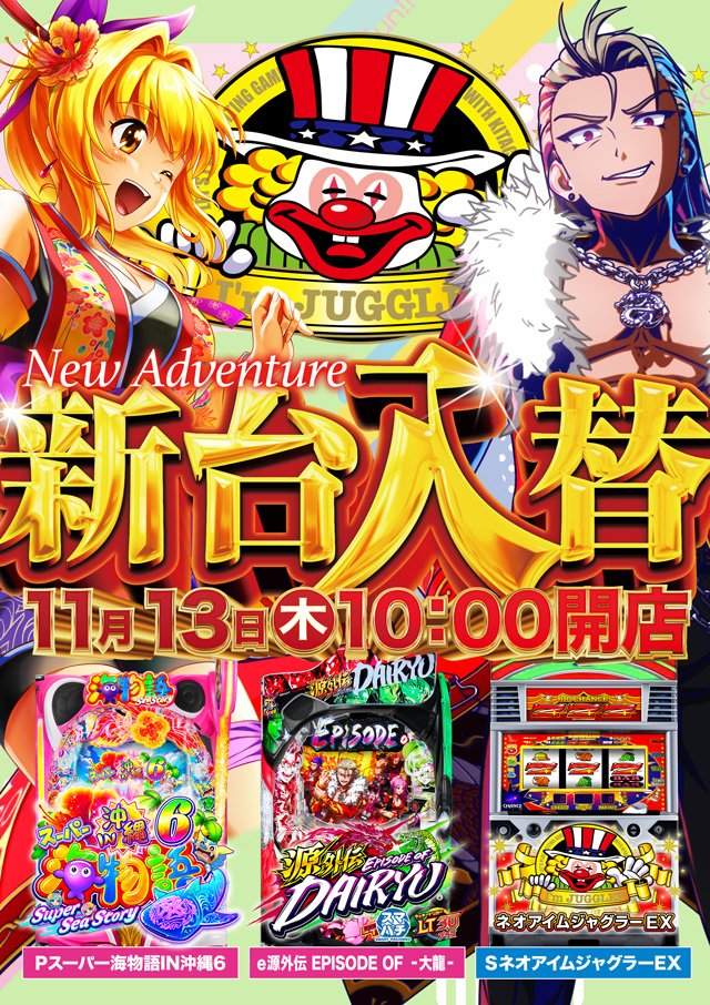 | 営業時間 | 10:00 ~ 23:00 会員カードをお持ちのお客様は、22:50迄延長遊技出来ます。 |