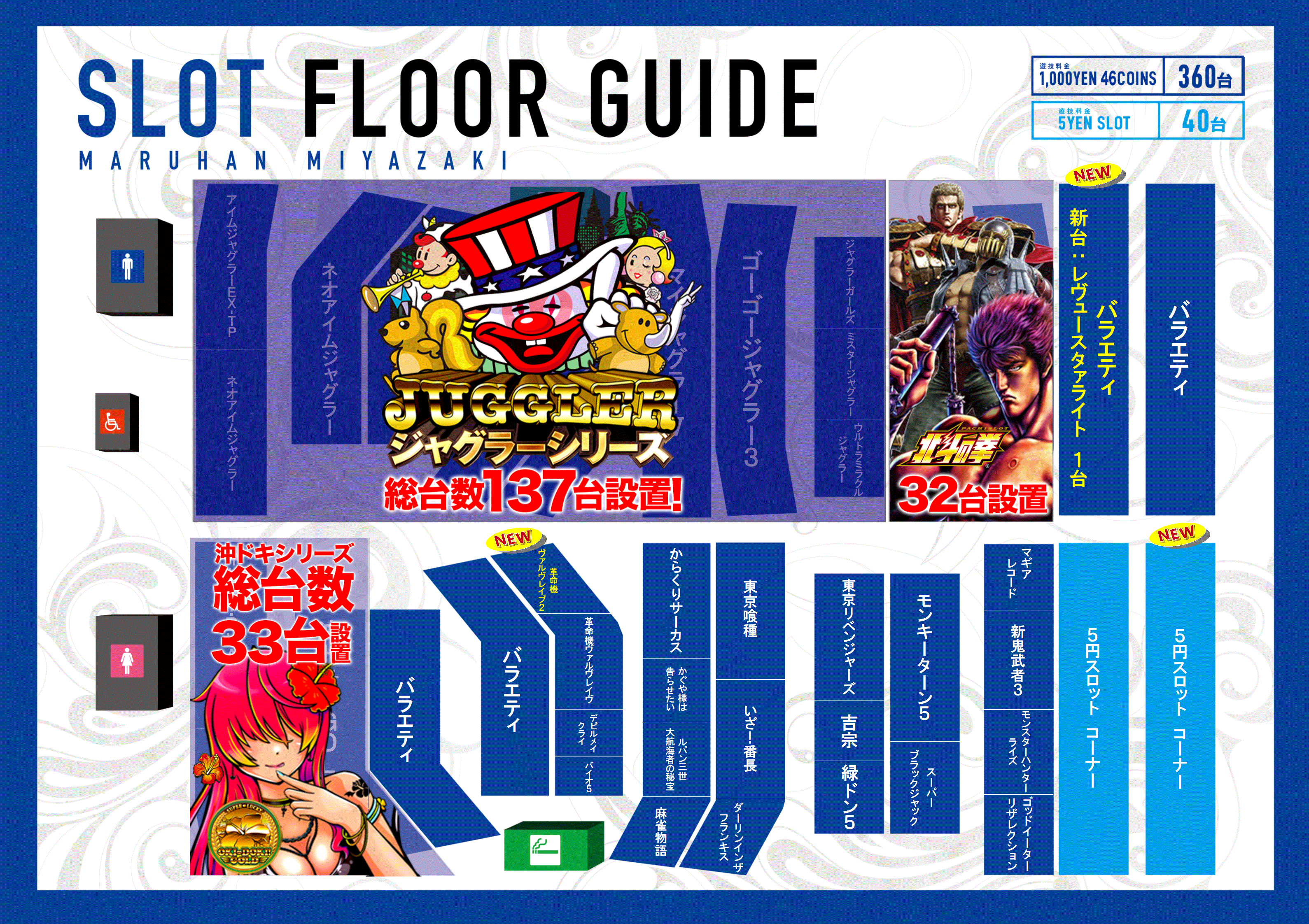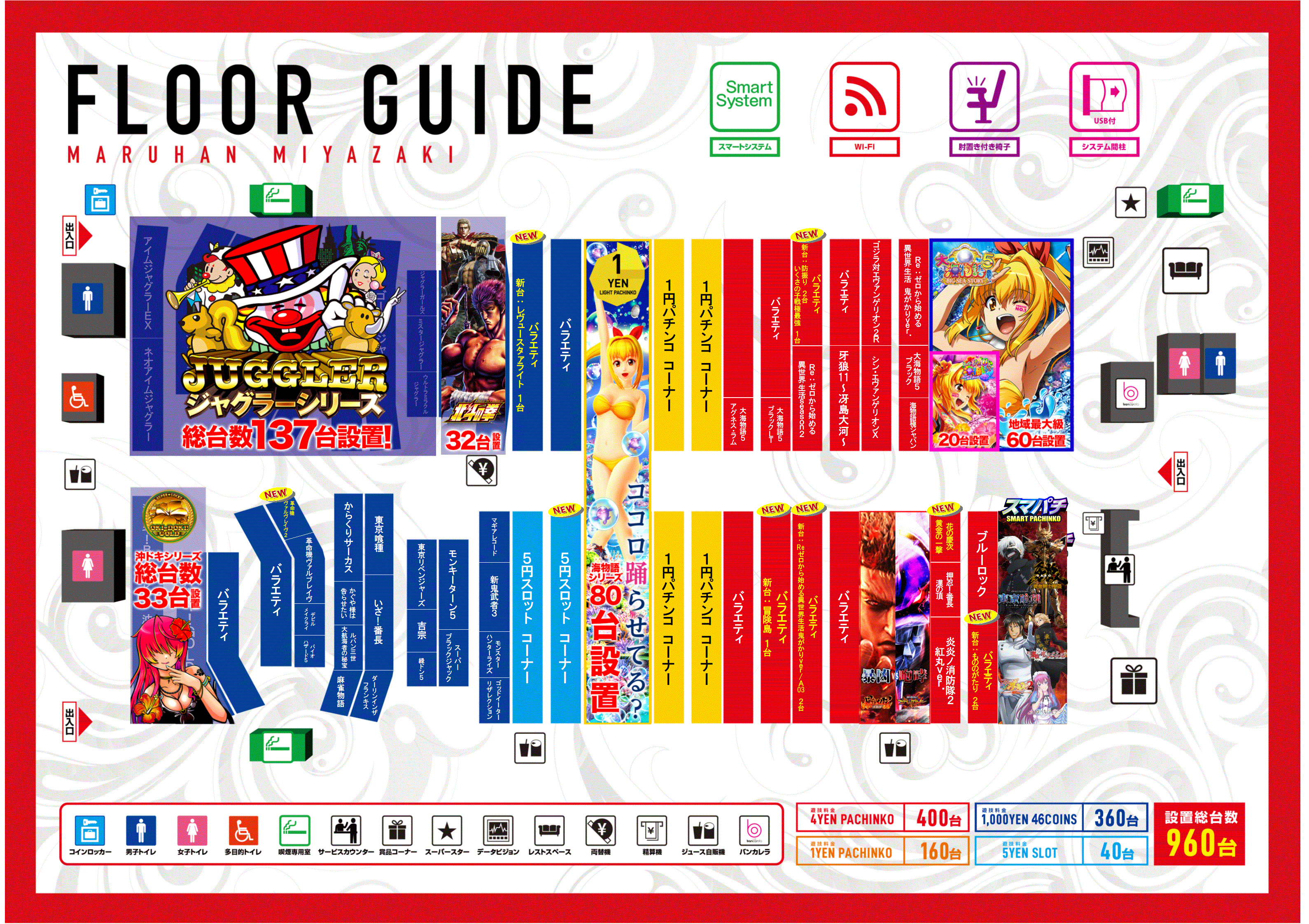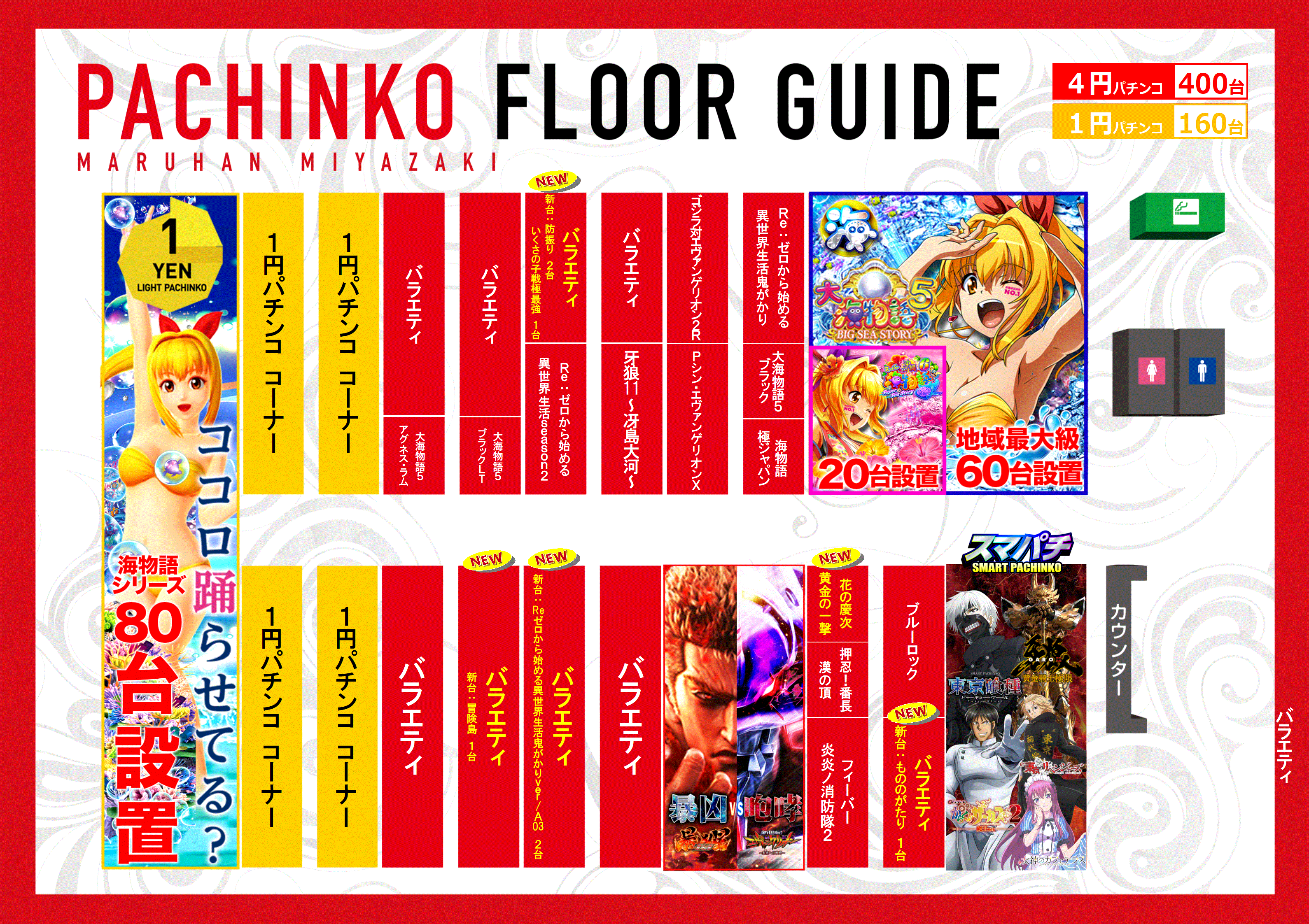 | 稼働台数 | パチンコ560台 / パチスロ400台 |