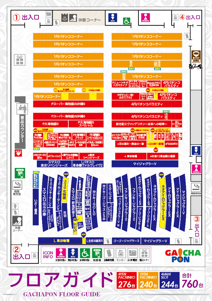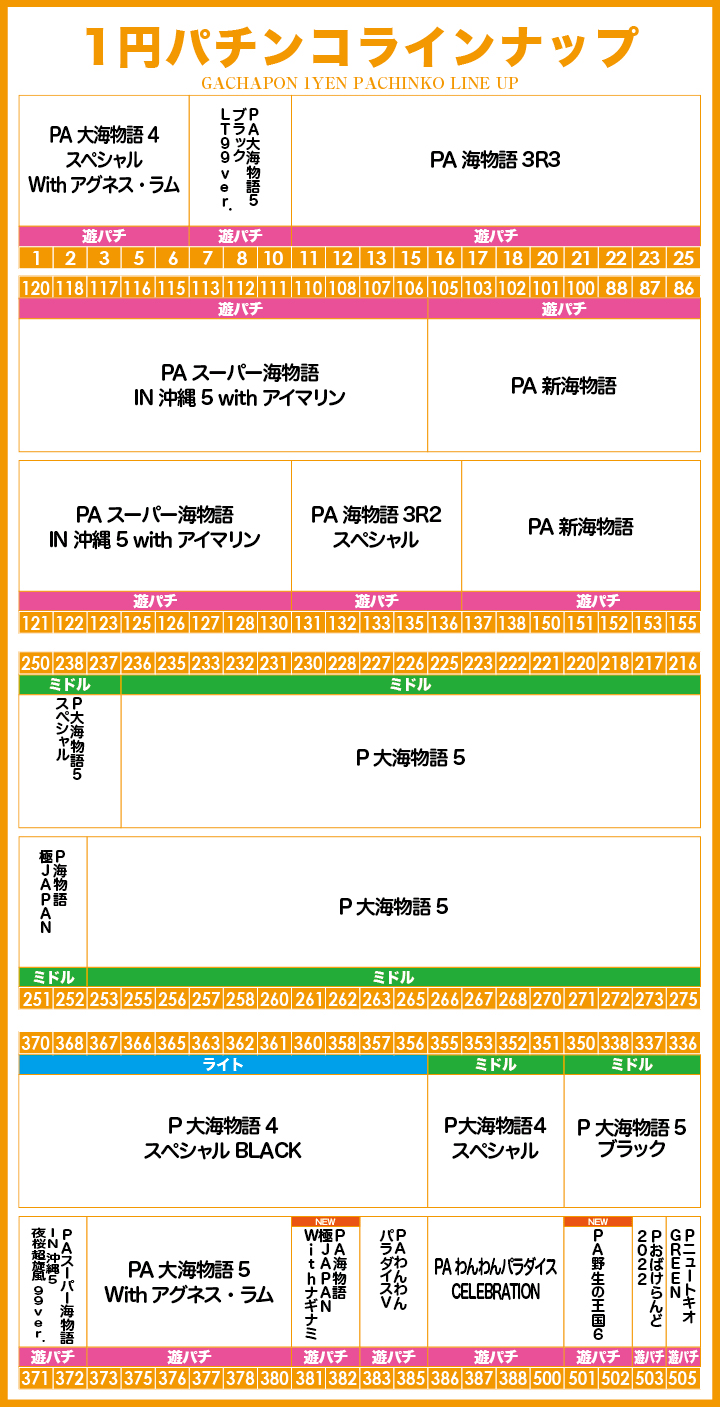 | 稼働台数 | パチンコ516台 / パチスロ244台 |
