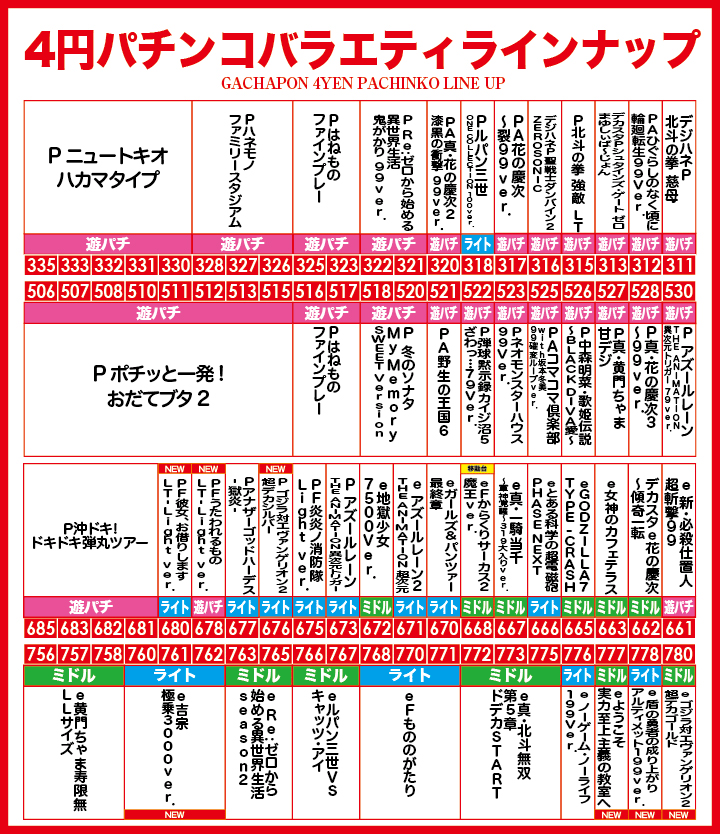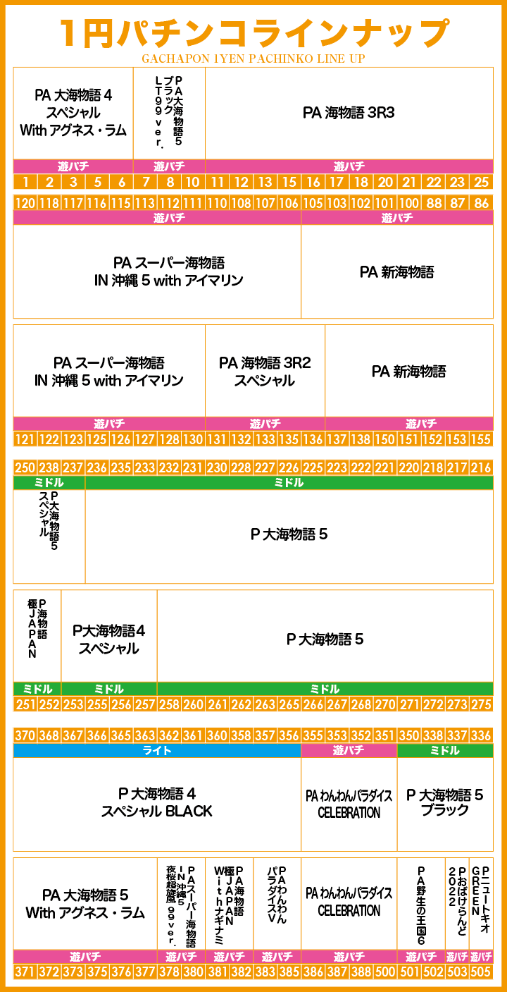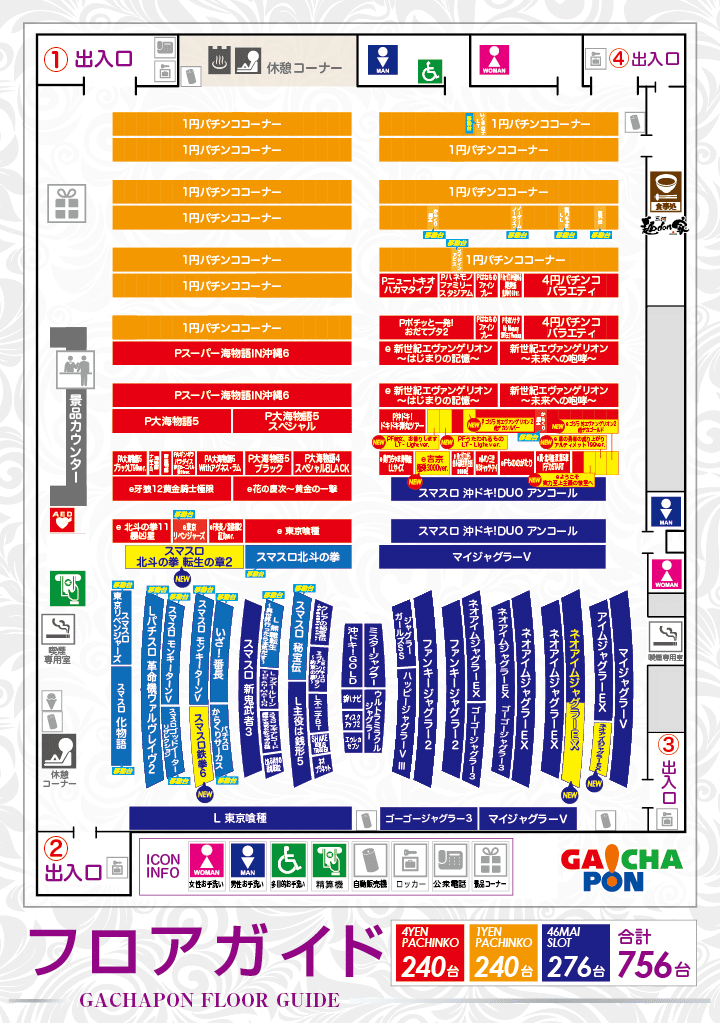 | 稼働台数 | パチンコ480台 / パチスロ276台 |