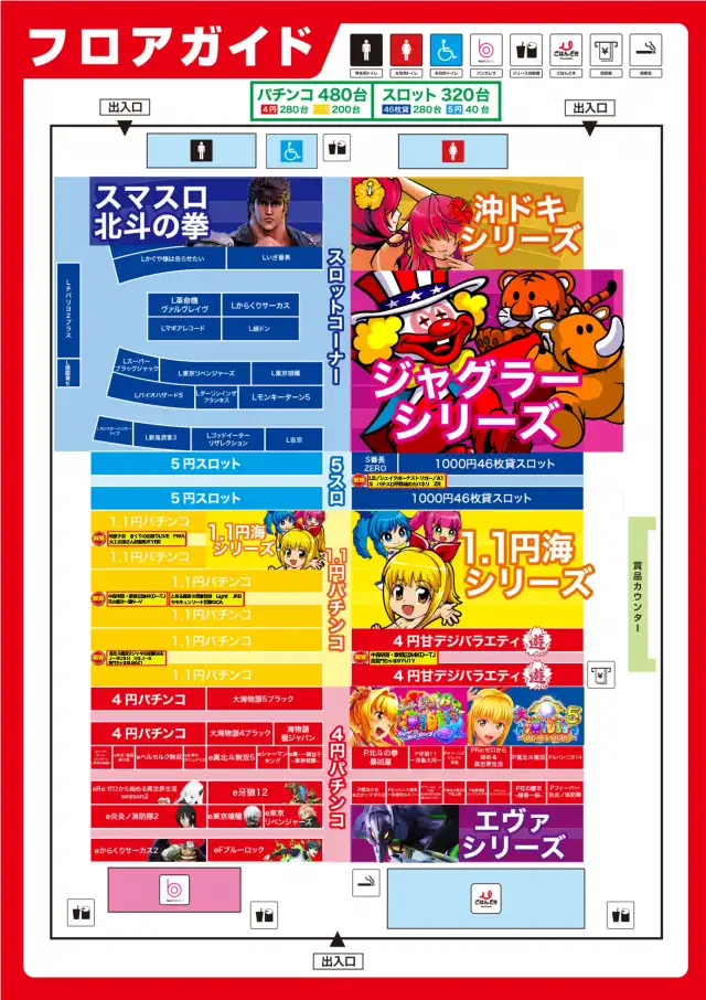 | 稼働台数 | パチンコ480台 / パチスロ320台 |