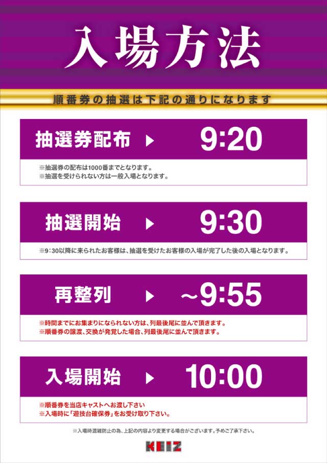 | 入場ルール | 抽選(09:30) |