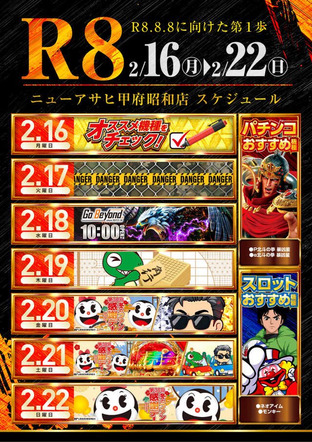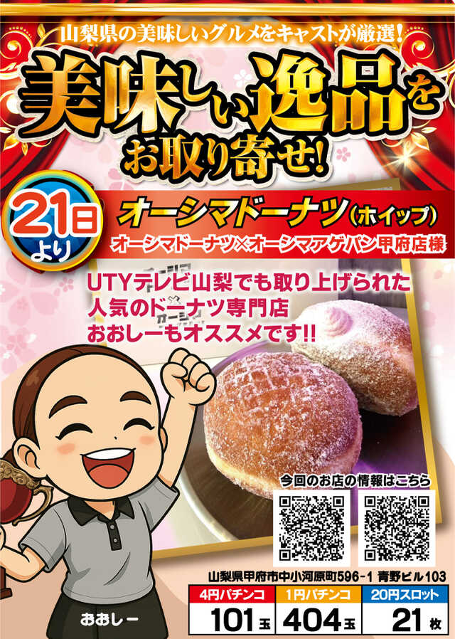 | 営業時間 | 10:00 ~ 22:45(定休日:新台入替日前日は店休日を頂きます(告知随時)。) |