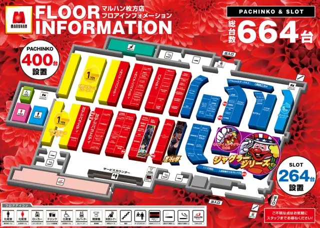 | 稼働台数 | パチンコ394台 / パチスロ262台 |