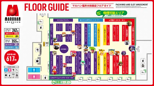 | 稼働台数 | パチンコ262台 / パチスロ355台 |