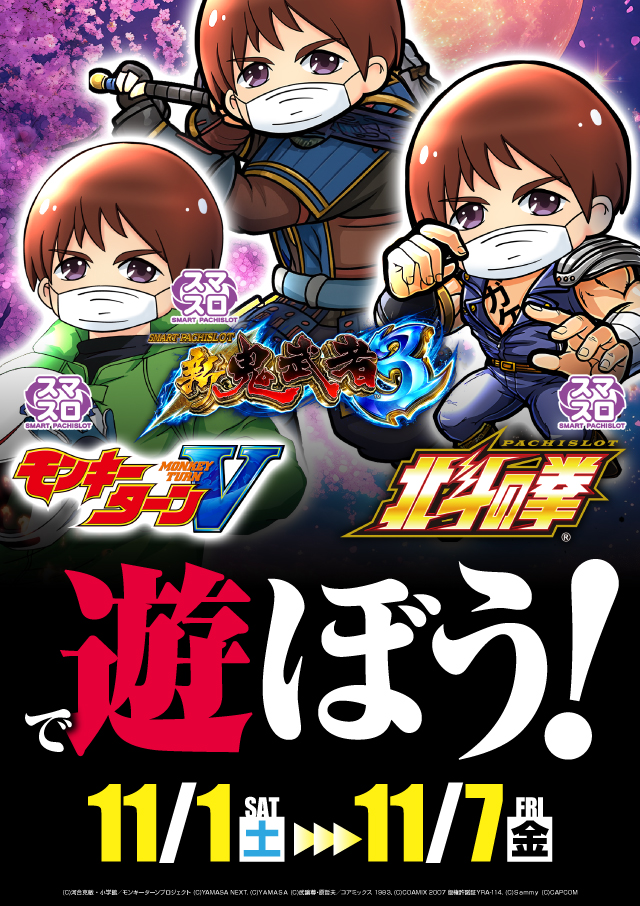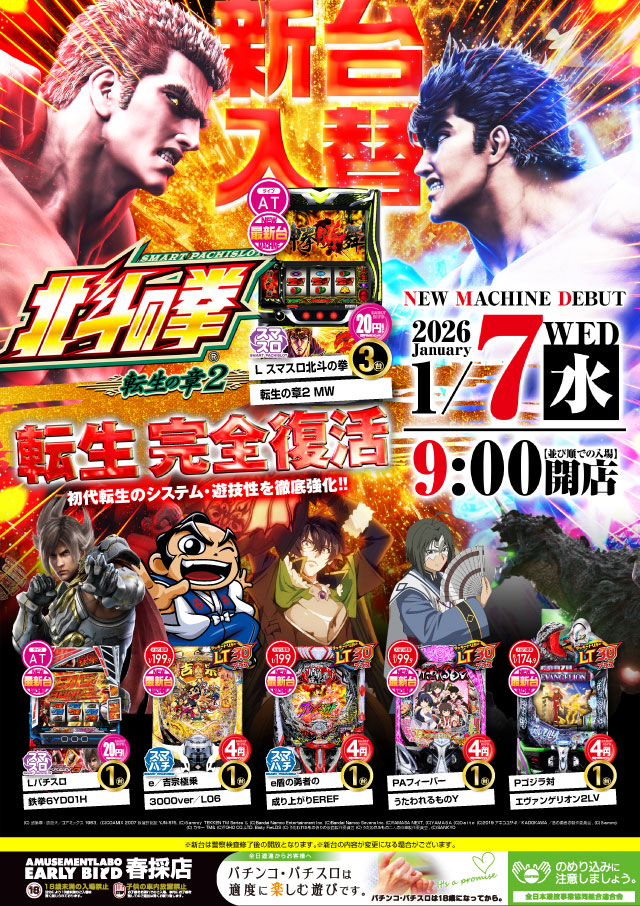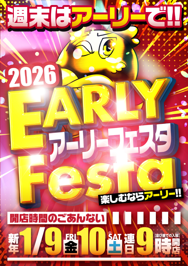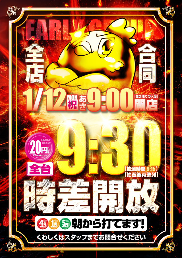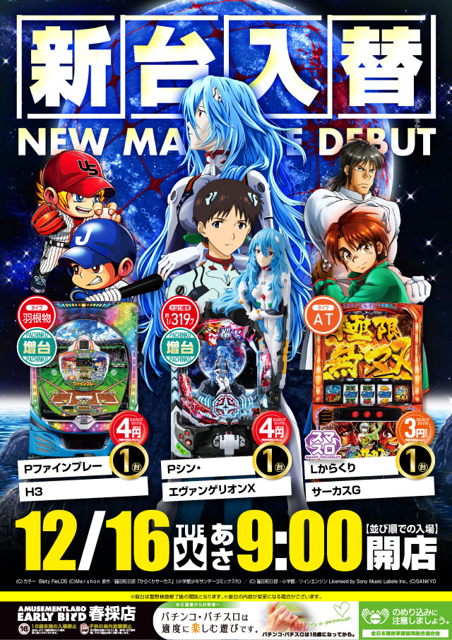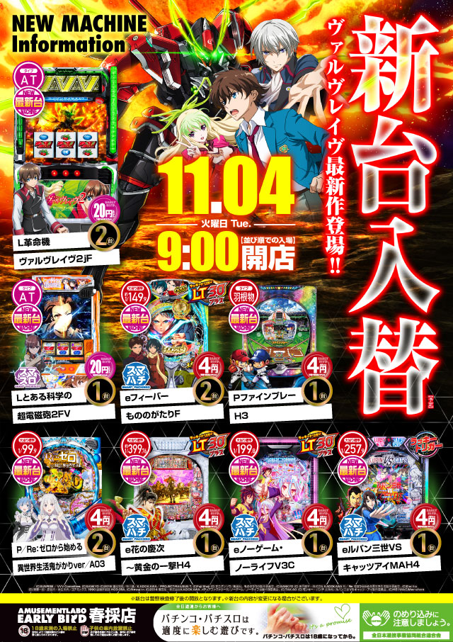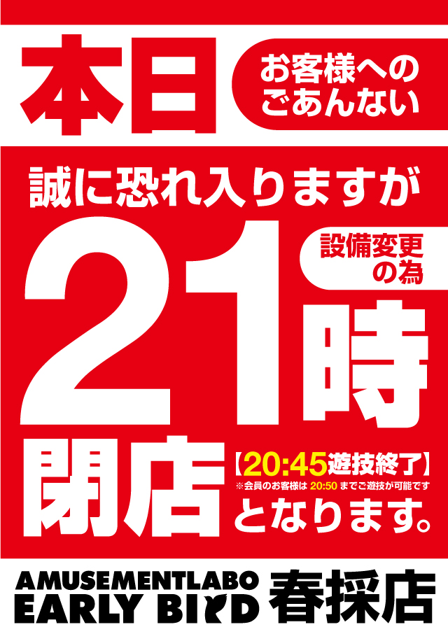 | 営業時間 | 09:00 ~ 23:00(定休日:年中無休) お客様遊技終了時間は22:45になります。 |